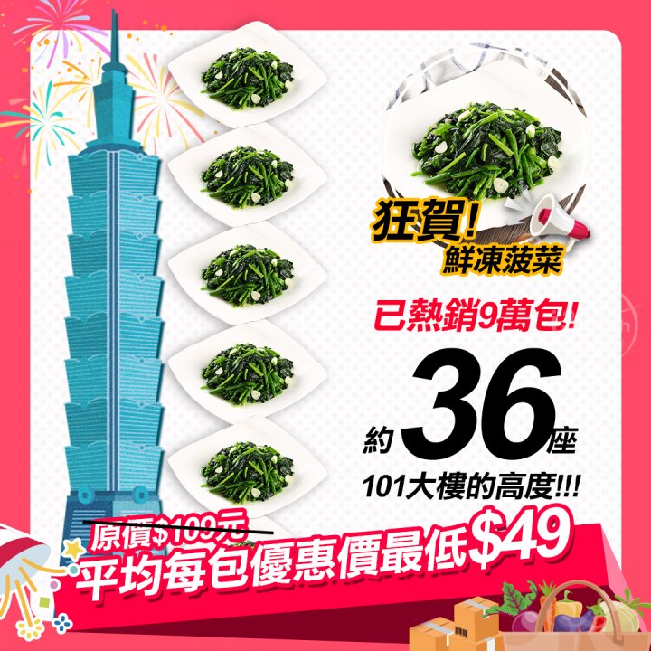 3:鮮凍優鮮菠菜:菠菜 [營養標示:每包含-熱量26g/蛋白質4.2g/脂訪0g(飽和脂肪0g)/碳水化合物5.8g/糖0g/鈉92mg]