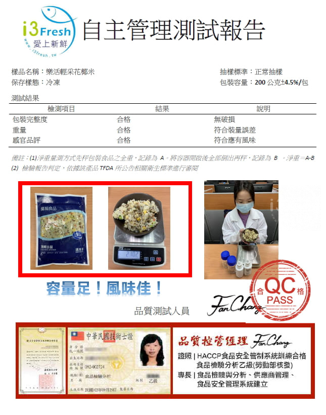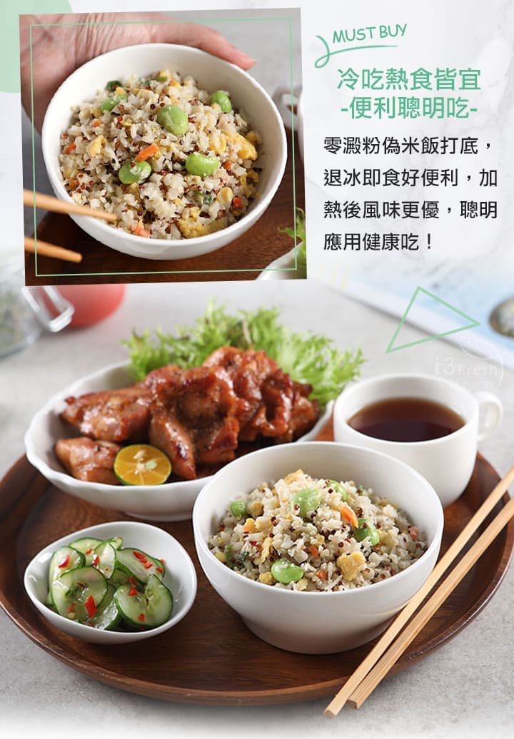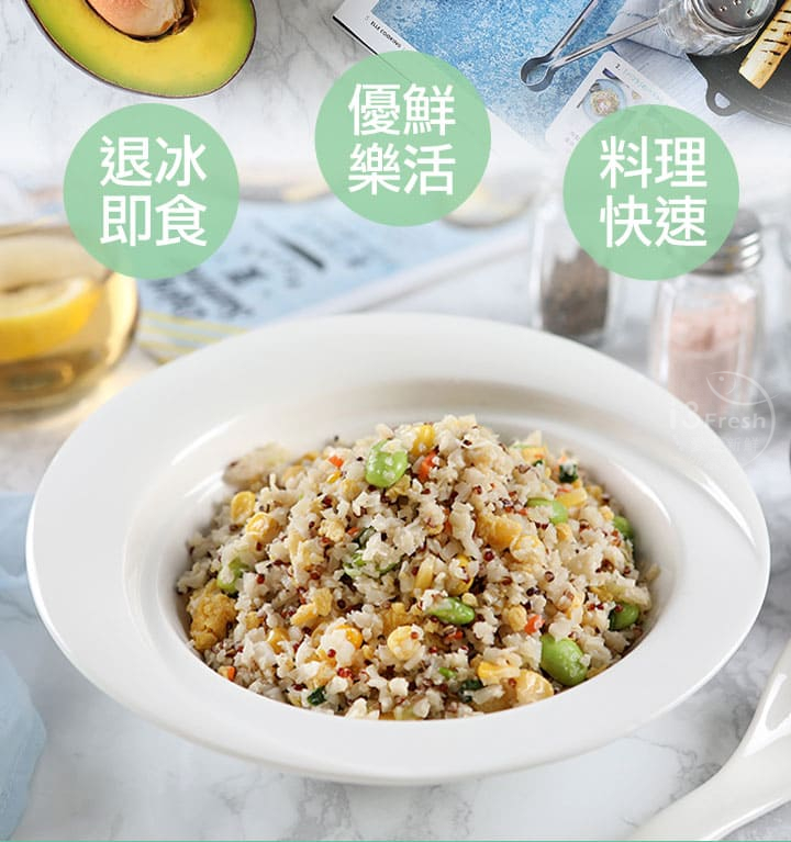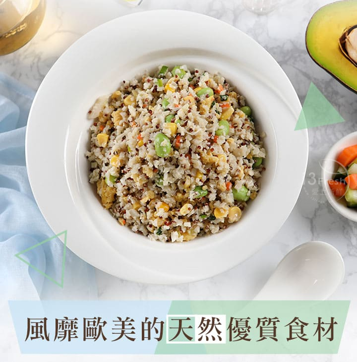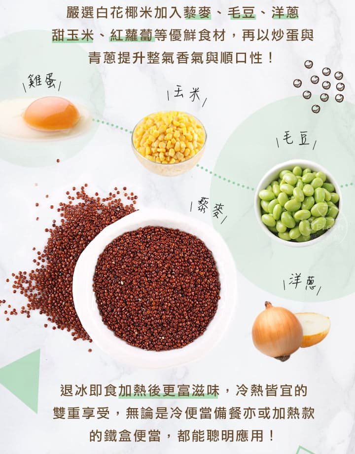 商品成份:花椰菜米、蛋、洋蔥、甜玉米粒、毛豆、大豆油、藜麥、紅蘿蔔、蔥、水、香油(芝麻油、大豆油)、蒜、糖、鹽、醬油、胡椒粉(地瓜澱粉、胡椒、辣椒、花椒)、蔬菜調味粉(鹽、糖、麥芽糊精、小麥水解蛋白、酵母抽出物、高麗菜抽出物、棕櫚油)