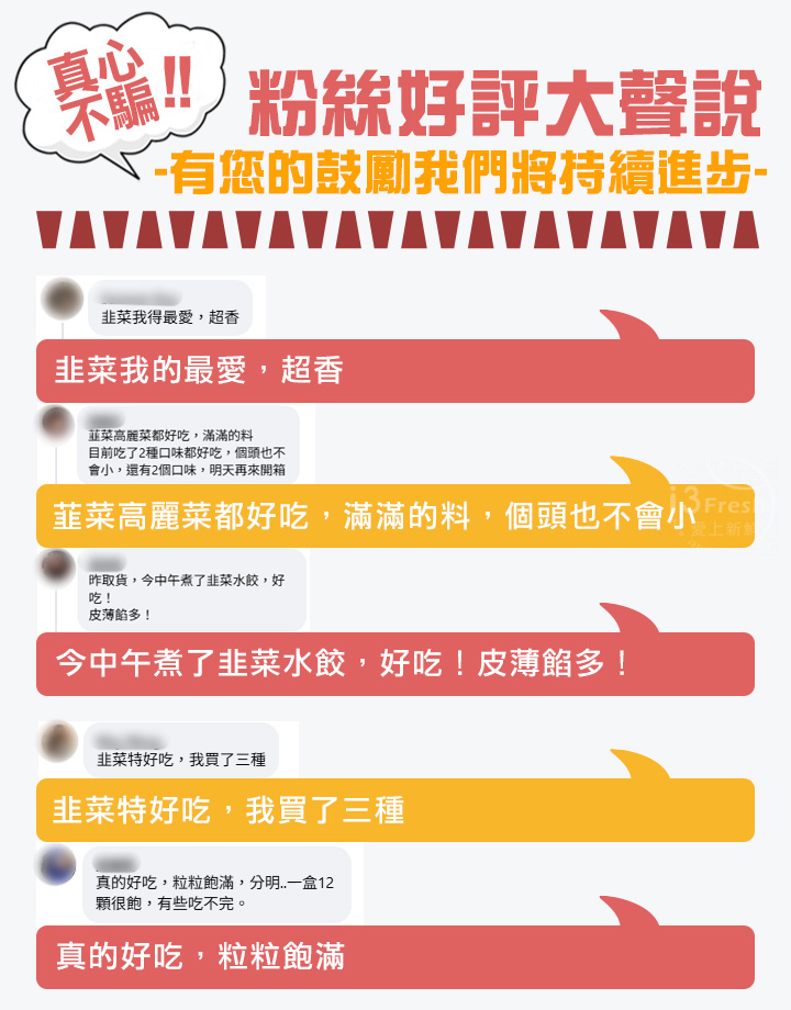 商品成分:豬前腿肉(台灣)、韭菜、青蔥、高湯(水、洋蔥、紅蘿蔔、芹菜、雞骨、豬皮(台灣)、昆布、柴魚片)、餃皮(麵粉、水、食鹽、磷酸二澱粉)、薑末、醬油(水、非基因改造黃豆(高蛋白豆片)、小麥、食鹽、酒精)、香油(大豆沙拉油、芝麻油)、米酒、雞粉(鹽,麥芽糊精,L-麩酸鈉,糖,玉米澱粉,雞肉粉,香料,酵母萃取物(酵母萃取物,鹽),雞油,棕櫚油(棕櫚油,硬質棕櫚油),調味劑(5'-次黃嘌呤核苷磷酸二鈉,5'-鳥嘌呤核苷磷酸二鈉),白胡椒)、海鹽、糖、白胡椒