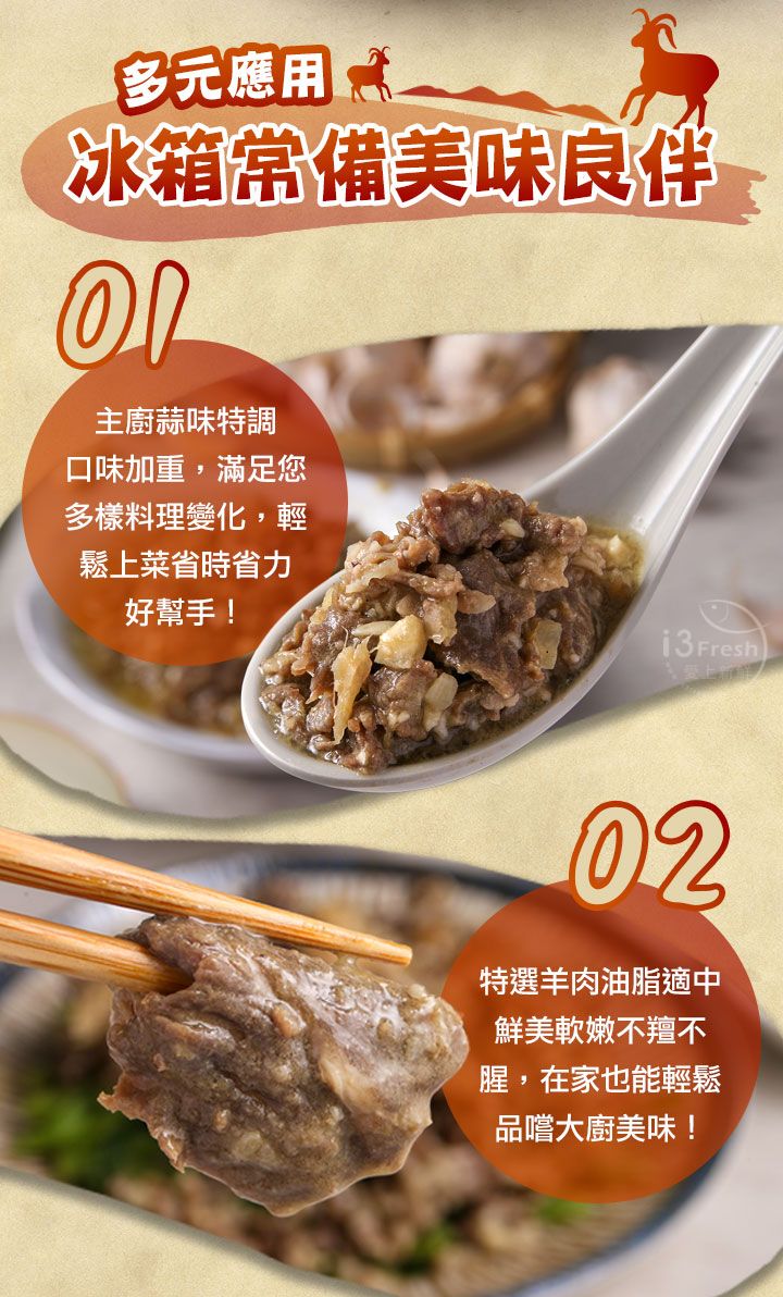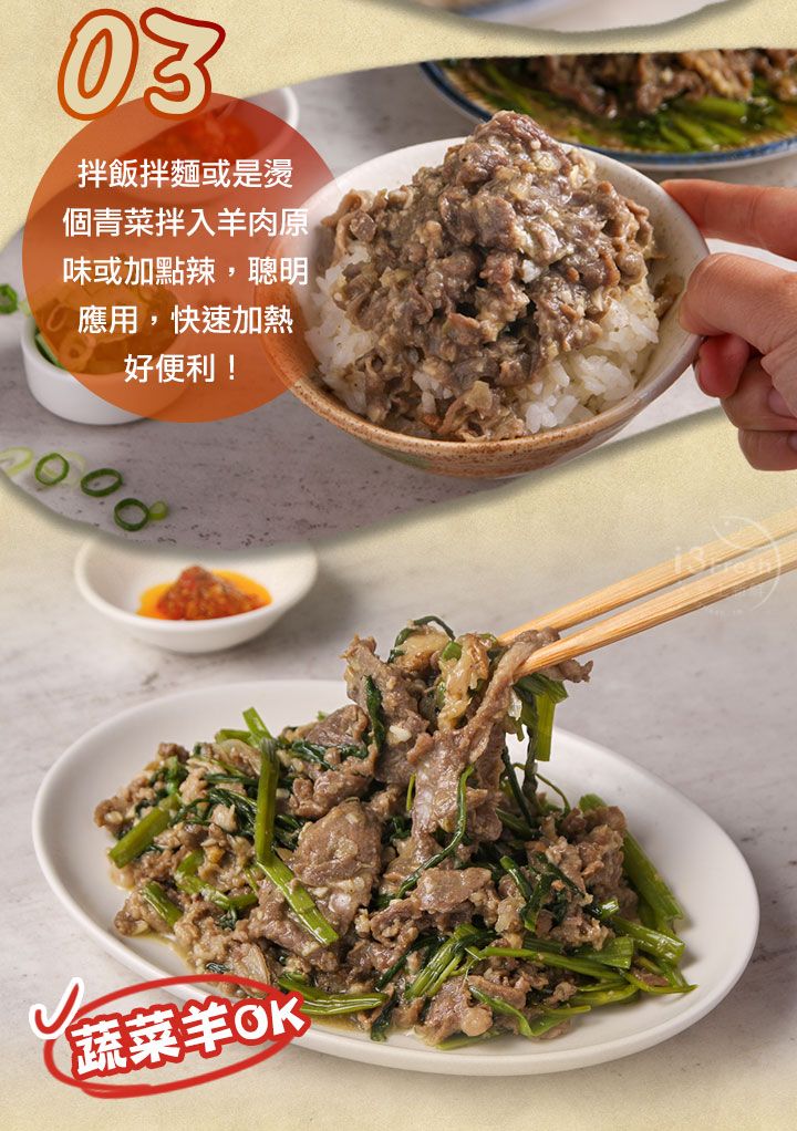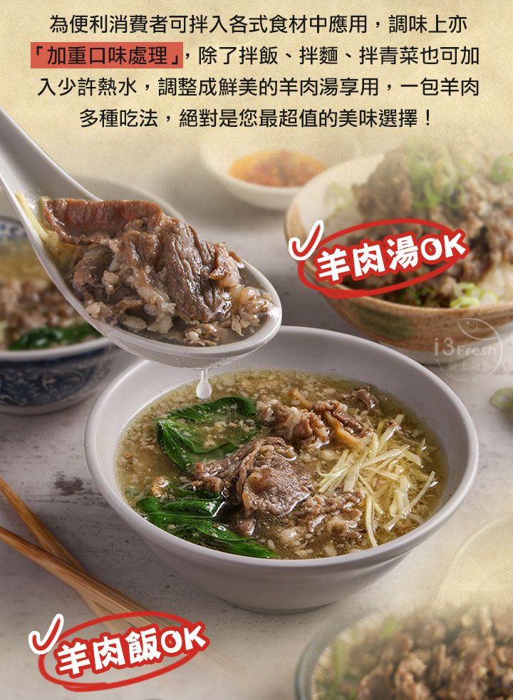 產品成份:羊肉、洋蔥、蒜頭、水、蔥、鰹魚醬油(醬油(脫脂大豆、大豆、小麥、鹽,水)、葡萄糖果糖糖漿、食鹽、砂糖、鰹柴魚萃取物、湯料(鰹魚、花鰹魚)、水解蛋白(大豆、鰹魚、玉米)、食用醋、魚類萃取物[水、鯷魚乾萃取物、還原水飴、花鰹魚乾萃取物、發酵調味料(大豆、鹽、酒精)、鰹柴魚萃取物、食鹽、砂糖、水解蛋白(鯷魚)、酵母萃取物]、酵母萃取物、糊精、複方調味劑(L-麩酸鈉、乳酸鈉(溶液)、醋酸鈉、5’-次黃嘌呤核苷磷酸二鈉、DL-胺基丙酸、反丁烯二酸一鈉、氯化鉀、琥珀酸二鈉、琥珀酸、香料)、食用酒精)、米酒、薑、蠔油(水、蔗糖轉化液糖、非基因改造黃豆(高蛋白豆片)、小麥、食鹽、黏稠劑(玉米糖膠、乙醯化己二酸二澱粉)、酵母抽出物、苯甲酸鈉(防腐劑)、香菇粉(單方))、鹽、乙醯化己二酸二澱粉(黏稠劑)。
