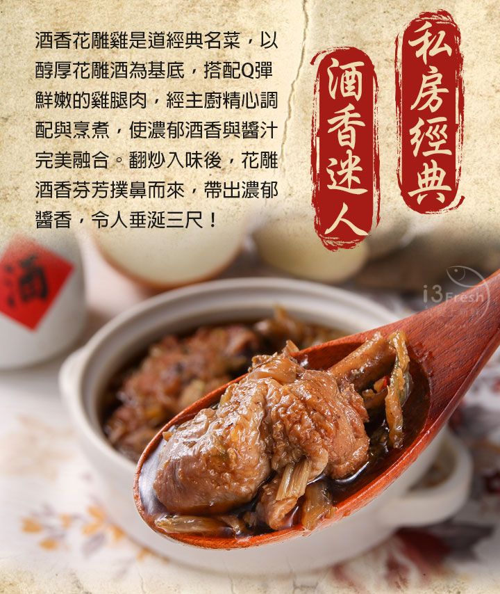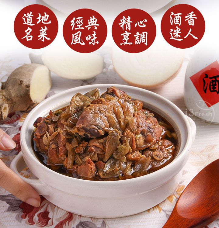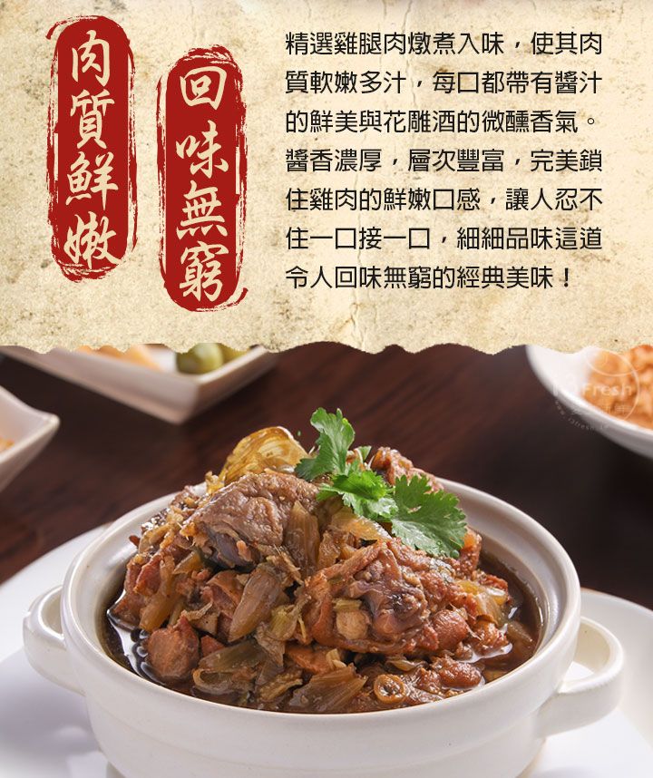 商品成分:水、雞腿肉、洋蔥、花雕酒(米、小麥)、醬油、香菇素蠔油(水、轉化液糖(蔗糖、水) 、非基因改造脫脂大豆片、小麥、食鹽、黏稠劑(乙醯化己二酸二澱粉、玉米糖膠)、酵母抽出物、苯甲酸鈉(防腐劑)、香菇粉)、薑、芹菜、紅蔥頭。