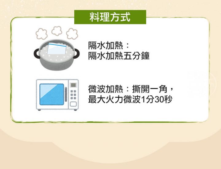 1. 隔水加熱:解凍後,隔水加熱五分鐘。