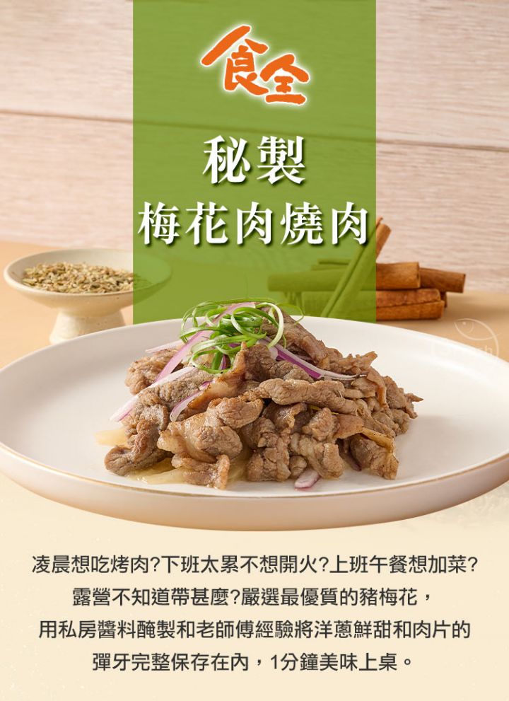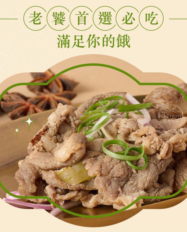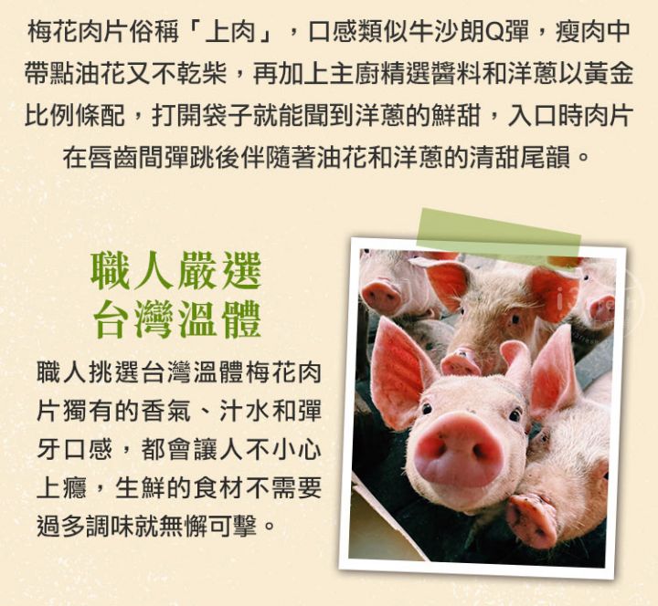 成分:豬梅花肉片(台灣)、水、糖、蒜頭、洋蔥、食鹽、無水葡萄糖、小茴香、桂蒂、甘草、肉桂、大茴香、丁香、白胡椒、麥芽糊精、辣椒、大蒜萃取物、肉類抽出物[L-麩酸鈉、豬肉抽出物、生育醇(抗氧化劑)、豬油(台灣)、糊精、D-木糖]、胺基乙酸、DL-胺基丙酸、甘草素(甜味劑)、乙基麥芽醇、5'-次黃嘌呤核苷磷酸二鈉、5'-鳥嘌呤核苷磷酸二鈉、琥珀酸二鈉