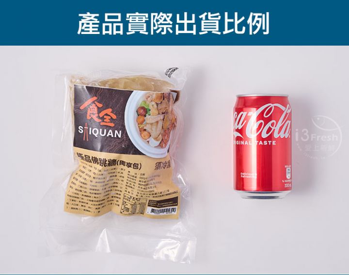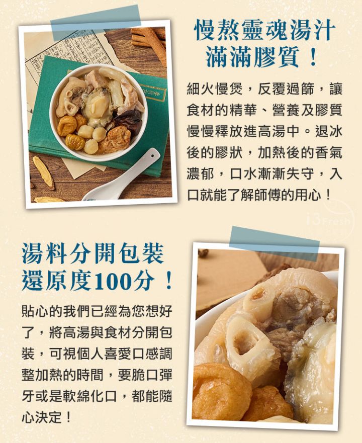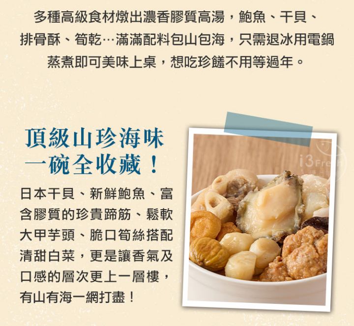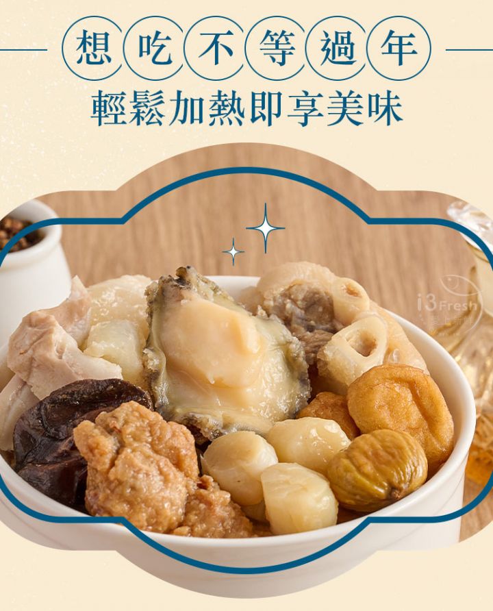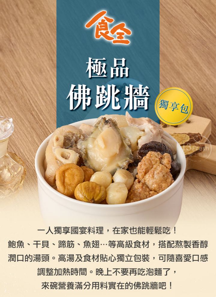 成分:高湯[水、雞爪、豬大骨(台灣)、調味劑 (L-麩酸鈉)、鹽]、日本干貝、鮑魚、芋頭、花菇、豬肚(台灣)、栗子、豬腳丁(台灣)、豬蹄筋(台灣)、冬粉翅(水、食用海藻膠、食用明膠、槴子黃色素)、鵪鶉蛋、排骨酥[(豬排骨(台灣)、糖、L-麩酸鈉、多磷酸鈉、氯化鈉、DL-胺基丙酸、香料、醬油、白胡椒粉、肉桂粉、大茴香粉、山奈粉、小茴香粉、二氧化矽、檸檬酸鈉、乳糖、麥芽糊精、甘草粉、琥珀酸二鈉、馬鈴薯澱粉、甘草酸鈉(甜味劑)、川芎粉、焦磷酸鈉(無水)、花椒粉、 5'-次黃嘌呤核苷磷酸二鈉、5'-鳥嘌呤核苷磷酸二鈉、葡萄糖漿、丁香粉、焦糖色素、大豆水解蛋白]、魚皮絲、脆筍、大白菜、蔥段、蒜仁