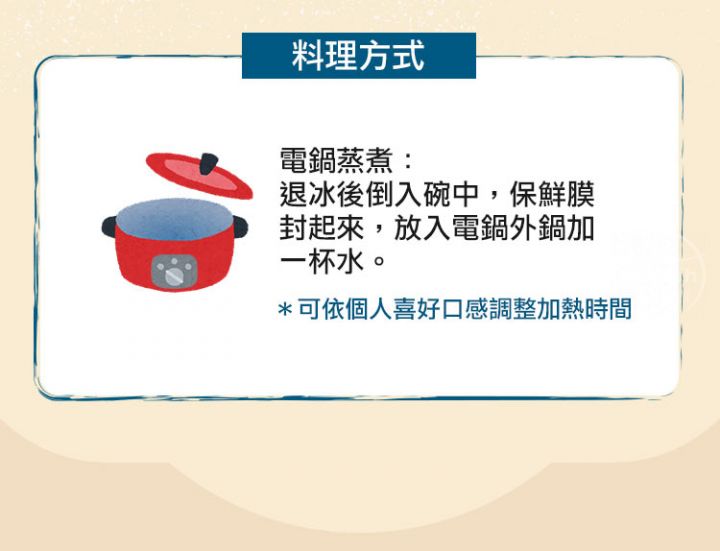 食用方式:電鍋蒸煮:解凍後,剪開包裝,分別倒入器皿,(建議加蓋以防水氣影響風味),放進電鍋,外鍋加入180cc的水。