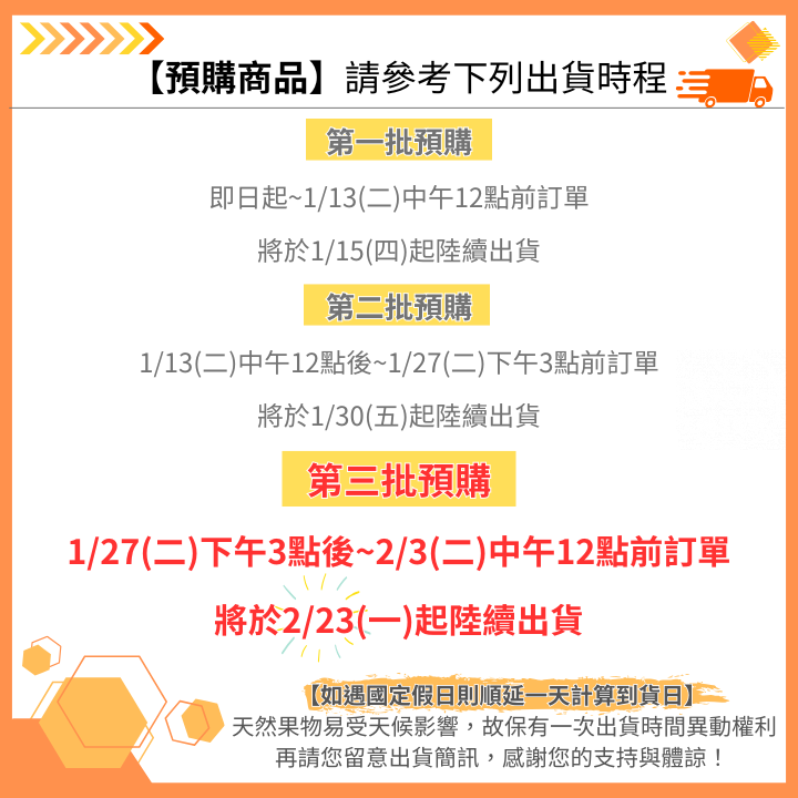 3. 訂單款項須於販售時間內完成付款,若未完成付款之訂單,將安排於下次出貨,造成不便敬請原諒。