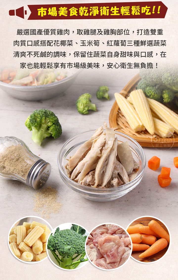 商品成分:雞肉、花椰菜 、水、紅蘿蔔、玉米筍、鹽、醬油、L-麩酸鈉、胡荽子、小茴香、八角、肉桂、丁香、花椒、甘草、胡椒