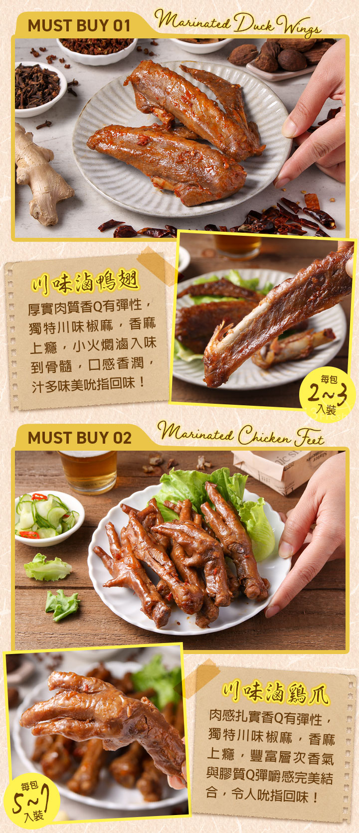 成分:鴨翅、水、醬油、米酒、砂糖、大豆沙拉油、蒜、薑、蔥、白糖、冰糖、豬油(台灣)、洋蔥、香菇素蠔油(黑豆、蔗糖、海鹽、糯米、昆布、香菇)、鹽、鮮美露(釀造醬油(使用非基因改造大豆)、風味調味液(食鹽、酒精、昆布、柴魚(鰹魚)、干貝)、轉化液糖(蔗糖、水)、水、食鹽、釀造醋(米醋)、酒精、酵母抽出物)、花雕酒(糯米、水、小麥) 、黑胡椒粉、白胡椒粉、洋蔥粉、蒜粉、孜然粉、乾辣椒、花椒、青花椒、五香粉(八角、肉桂、茴香子、花椒、丁香)、肉桂粉、中藥包(八角、小茴香、多香果、肉桂、高良薑、白芷、草果、蓽茇、花椒、山奈、丁香)