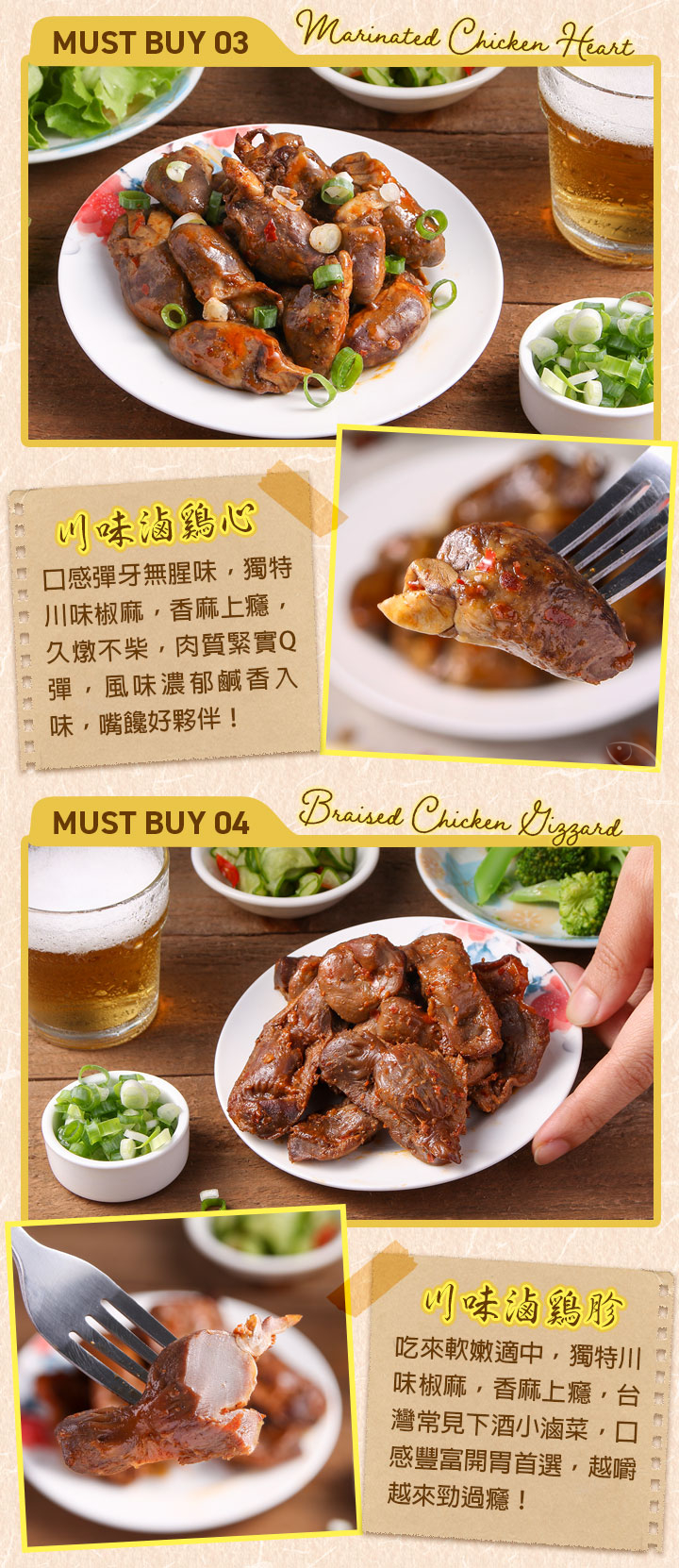 成分:雞心、水、醬油、米酒、砂糖、大豆沙拉油、蒜、薑、蔥、白糖、冰糖、豬油(台灣)、洋蔥、香菇素蠔油(黑豆、蔗糖、海鹽、糯米、昆布、香菇)、鹽、鮮美露(釀造醬油(使用非基因改造大豆)、風味調味液(食鹽、酒精、昆布、柴魚(鰹魚)、干貝)、轉化液糖(蔗糖、水)、水、食鹽、釀造醋(米醋)、酒精、酵母抽出物)、花雕酒(糯米、水、小麥) 、黑胡椒粉、白胡椒粉、洋蔥粉、蒜粉、孜然粉、乾辣椒、花椒、青花椒、五香粉(八角、肉桂、茴香子、花椒、丁香)、肉桂粉、中藥包(八角、小茴香、多香果、肉桂、高良薑、白芷、草果、蓽茇、花椒、山奈、丁香)