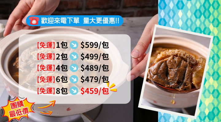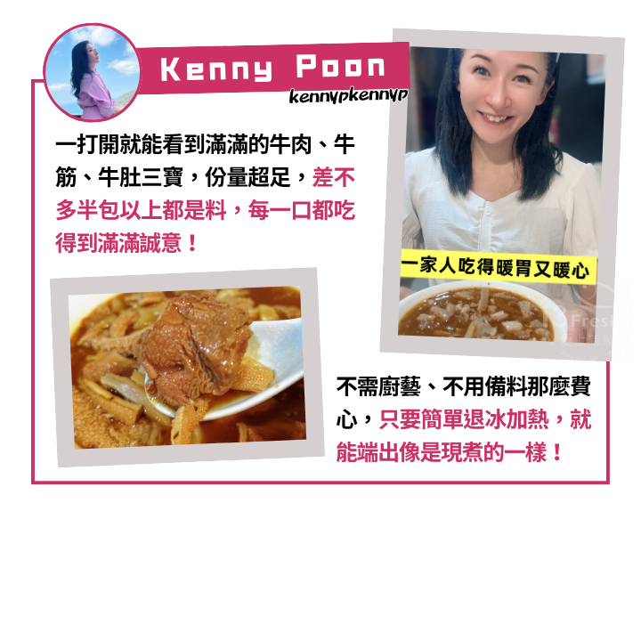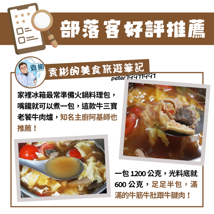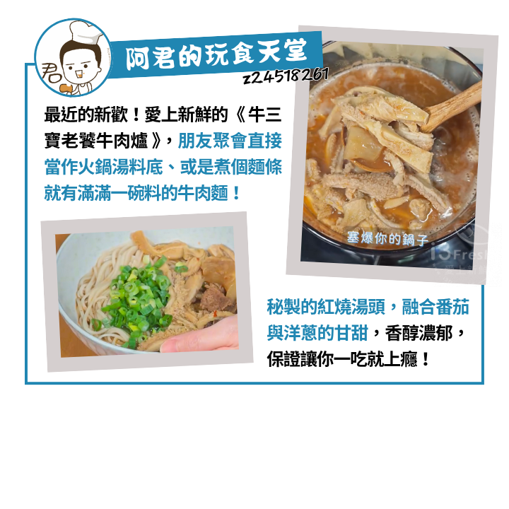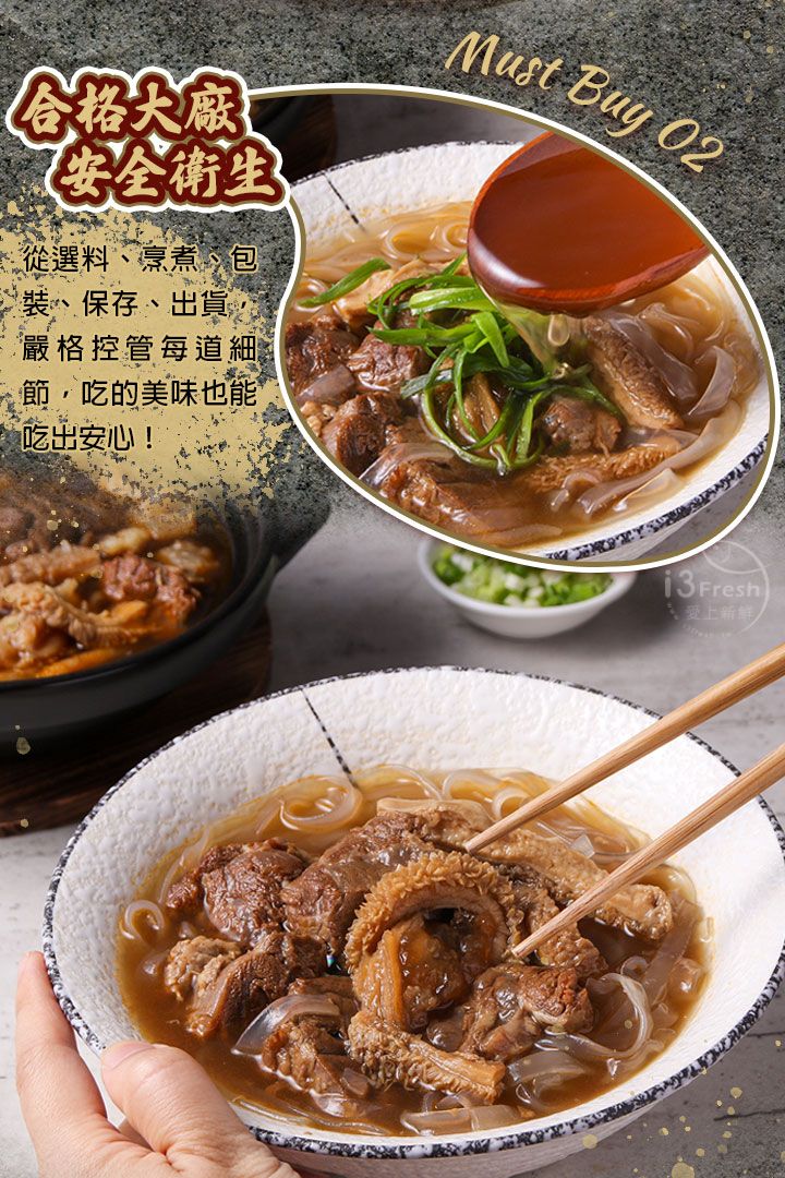 成分:水、牛肉塊(巴拉圭)、牛肚(巴拉圭)、牛筋(巴拉圭)、醬油[(水、脫脂大豆(非基因改造)、小麥、鹽、轉化液糖(蔗糖、水)、酒精、調味劑(琥珀酸二鈉、5'-次黃嘌呤核苷磷酸二鈉、5'-鳥嘌呤核苷磷酸二鈉)、甜味劑(甘草素)]、辣豆瓣[(辣椒、水、非基因改造黃豆、黏稠劑(乙醯化己二酸二澱粉)、麻油、調味劑(L-麩酸鈉、5’-次黃嘌呤核苷磷酸二鈉、5’-鳥嘌呤核苷磷酸二鈉)、糖、黏稠劑(玉米糖膠)、乳酸)]、蔥、洋蔥、牛番茄、蕃茄糊、番茄醬(水、番茄糊、高果糖糖漿、鹽、醋)、老薑、鹽、米酒、牛晶粉[(鹽、L-麩酸鈉、糖、香料、麥芽糊精、玉米澱粉、牛油、水解玉米蛋白(水解玉米蛋白、麥芽糊精、鹽、葵花籽油)、牛肉風味調味料[牛肉萃取物(鹽、牛肉、麥芽糊精)、鹽、L-麩酸鈉、牛油、焦糖色素、5'-次黃嘌呤核苷磷酸二鈉、5'-鳥嘌呤核苷磷酸二鈉]、牛肉萃取物[牛肉萃取物、牛骨高湯(牛骨、鹽)、鹽、分離大豆蛋白、大豆卵磷脂]、洋蔥粉、焦糖色素、調味劑 (5’-次黃嘌呤核苷磷酸二鈉、5’-鳥嘌呤核苷磷酸二鈉)、二氧化矽、大蒜粉、檸檬酸、黑胡椒粉)]、糖、老抽(水、大豆、糖、鹽、小麥粉)、蒜、滷包(八角、小茴香、花椒、肉桂、豆蔻、乾薑)、八角、己二烯酸鉀(防腐劑)、雞粉(鹽、麥芽糊精、蔗糖、雞肉粉、雞油、酵母抽出物、胺基乙酸、DL-胺基丙酸、5' -次黃嘌呤核苷磷酸二鈉、5' -鳥嘌呤核苷磷酸二鈉、醬油粉、琥珀酸二鈉)