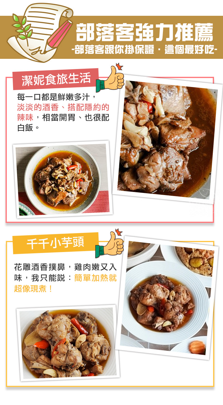 商品成分:雞肉.水.薑.蒜.花雕酒(米.小麥).醬油.香油(大豆沙拉油.芝麻油).料理米酒(米.精製食用酒精).辣椒.醬油膏[水.黑豆.砂糖.食鹽.非基改脫脂黃豆.小麥.糯米.乙醯化己二酸二澱粉.酵母抽出物.調味劑(琥珀酸二鈉).甜味劑(甘草萃)].冰糖.辣豆瓣[黃豆(非基因改造).辣椒.水.鹽.糖.調味劑(DL-胺基丙酸.琥珀酸二鈉.5'-次黃嘌呤核苷磷酸二鈉.5'-鳥嘌呤核苷磷酸二鈉.胺基乙酸).麻油.乳酸].樹薯澱粉.紹興酒(糯米.蓬萊米.小麥).辣椒醬[辣椒.水.鹽.砂糖.麻油.黏稠劑(乙醯化己二酸二澱粉.玉米糖膠).調味劑(L-麩酸鈉.琥珀酸二鈉).甜味劑(醋磺內酯鉀.甘草萃).防腐劑(己二烯酸鉀)1.0g/Kg以下.品質改良劑(偏磷酸鈉).著色劑(食用紅色七號.食用紅色四十號)].黑豆蔭豆豉(黑豆.砂糖.食鹽.大豆沙拉油.醬油).粘稠劑(乙醯化己二酸二澱粉).豆腐乳[非基因改造黃豆.水.糙米.砂糖.鹽.檸檬酸.硫酸鈣.食用酒精.辣椒.品質改良劑-豆腐用消泡劑(完全氫化棕梠油脂.大豆卵磷脂.脂肪酸山梨醇酐酯.二氧化矽)].蒜粉[蒜粉.品質改良劑(二氧化矽)].鹽.糖.調味料(麥芽糊精.食鹽.蔗糖.酵母抽出物.黃豆水解蛋白.香菇抽出物.高麗菜抽出物).白胡椒粉