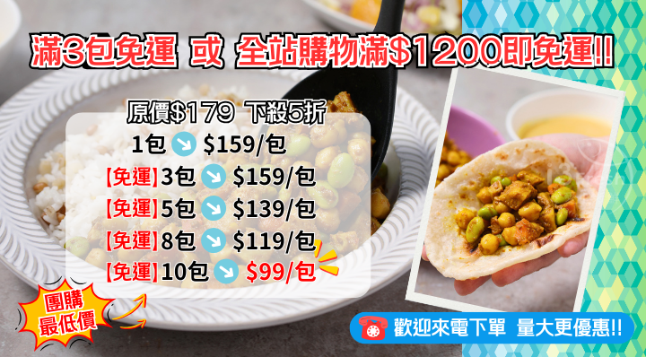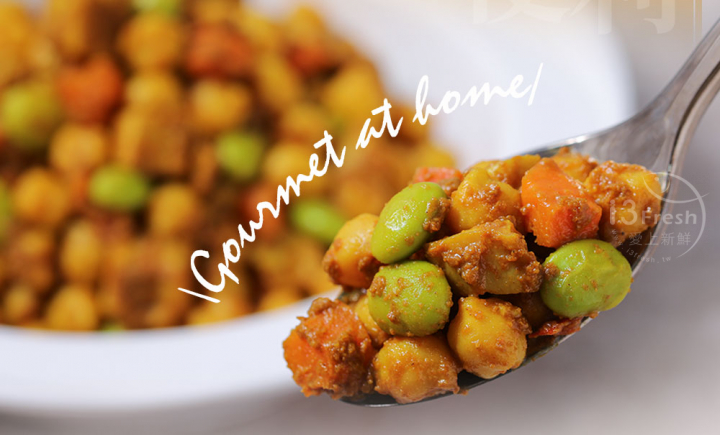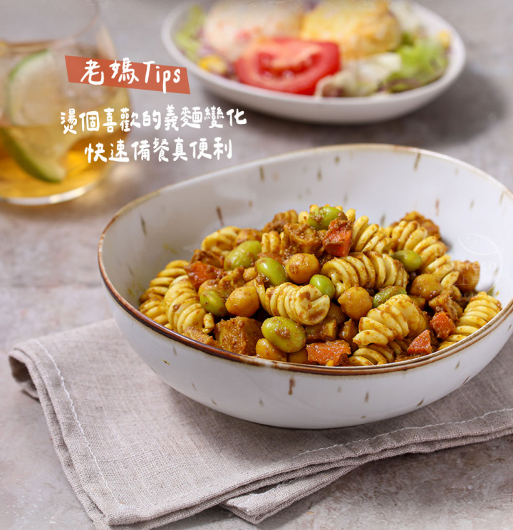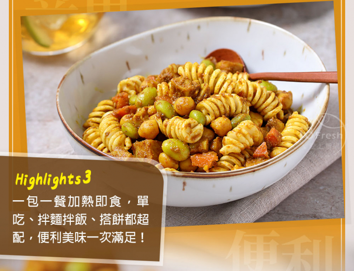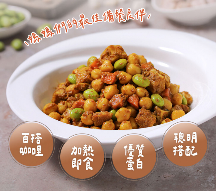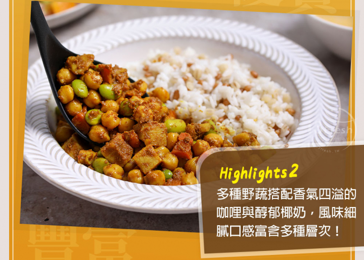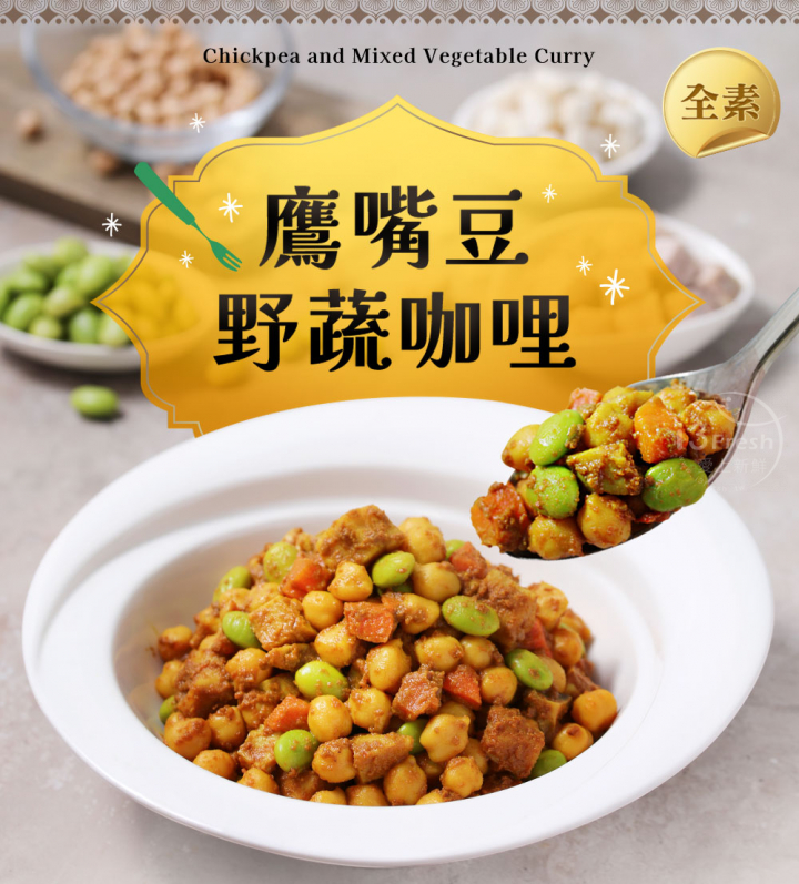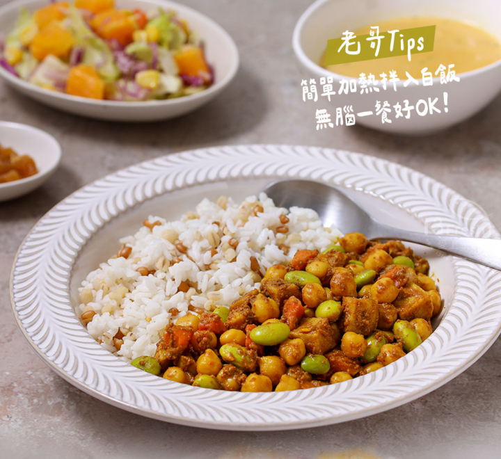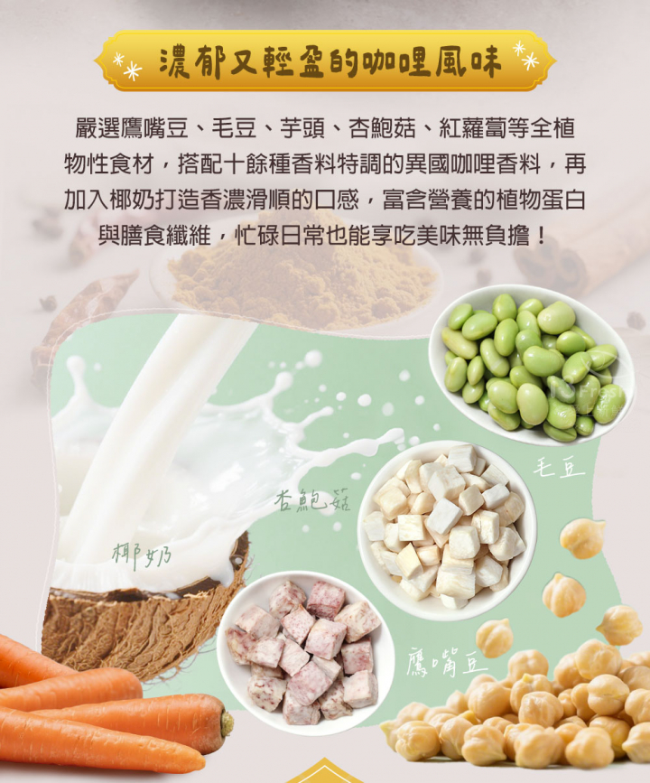 成分 : 鷹嘴豆、水、杏鮑菇、椰奶(椰子萃取物、水)、毛豆(非基因改造)、芋頭(芋頭、棕櫚油)、紅蘿蔔、咖哩粉(胡荽、薑黃、澳洲湖鹽、馬芹、葫蘆巴、薑母、葛縷子、肉桂、黑胡椒、丁香、辣椒、月桂葉、小茴香)、鹽、糖、辣椒、非基因改造分離大豆蛋白、蕃茄粉、蔬菜調味粉(鹽、糖、麥芽糊精、小麥水解蛋白、酵母抽出物、高麗菜抽出物、棕櫚油)、非基因改造玉米澱粉、非基因改造玉米發酵粉(麥芽糊精、發酵玉米)、香菇調味料(香菇、鹽、香菇萃取物)、肉荳蔻粉