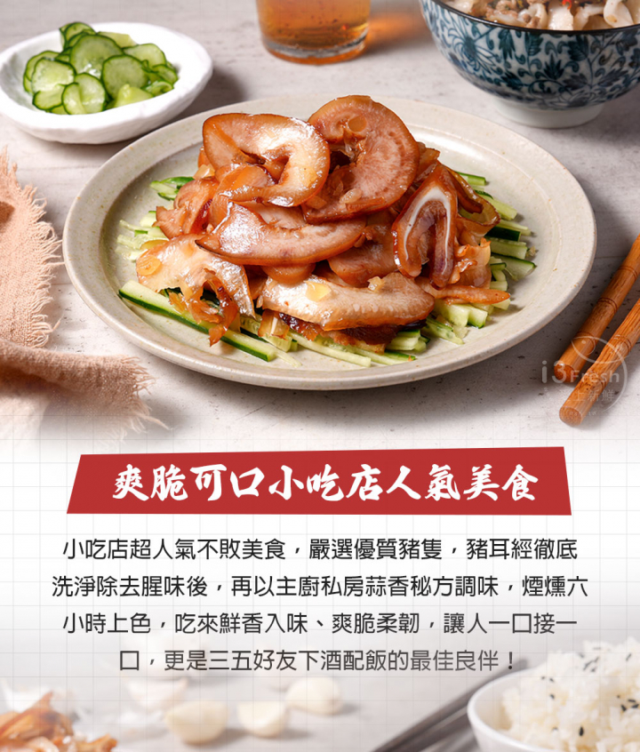 商品成分:豬耳絲【豬頭皮、豬耳朵、砂糖、食鹽、味精、蒜頭、蔥、辣椒、天然色素(紅麴色素)、香料、中鏈三酸甘油酯、麥芽糊精、D-木糖】、水、大豆沙拉油、芝麻油、鮮雞風味粉【食鹽、L-麩酸鈉、麥芽糊精、酵母抽取物、砂糖、水解植物大豆蛋白粉、洋蔥粉、香料】、食鹽、味鮮【L-麩酸鈉、琥珀酸二鈉、食鹽、5'-鳥嘌呤核苷磷酸二鈉、5'-次黃嘌呤核苷磷酸二鈉、胺基乙酸、DL-胺基丙酸】、砂糖、五香粉(小茴香、肉桂、陳皮、八角、胡荽子、甘草、丁香、當歸、芹菜籽、川芎、山奈) 、蒜