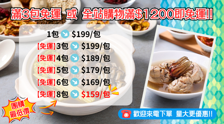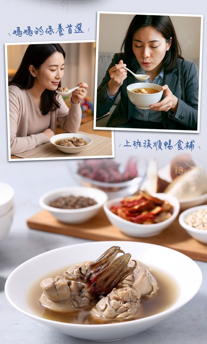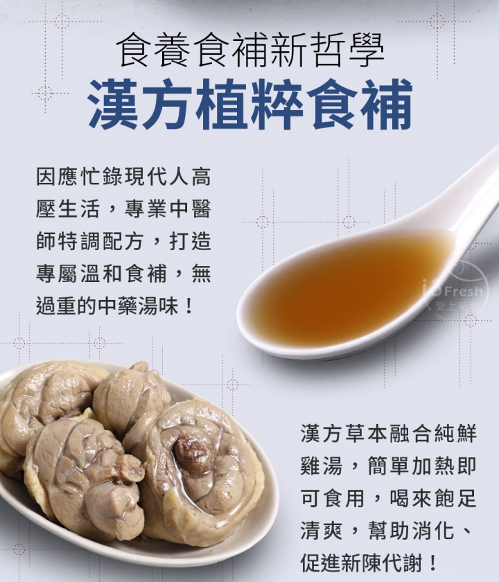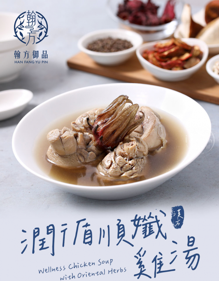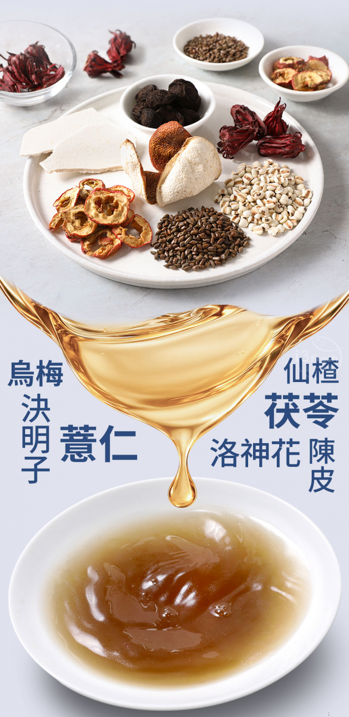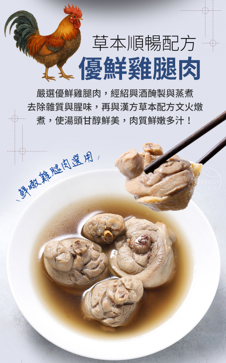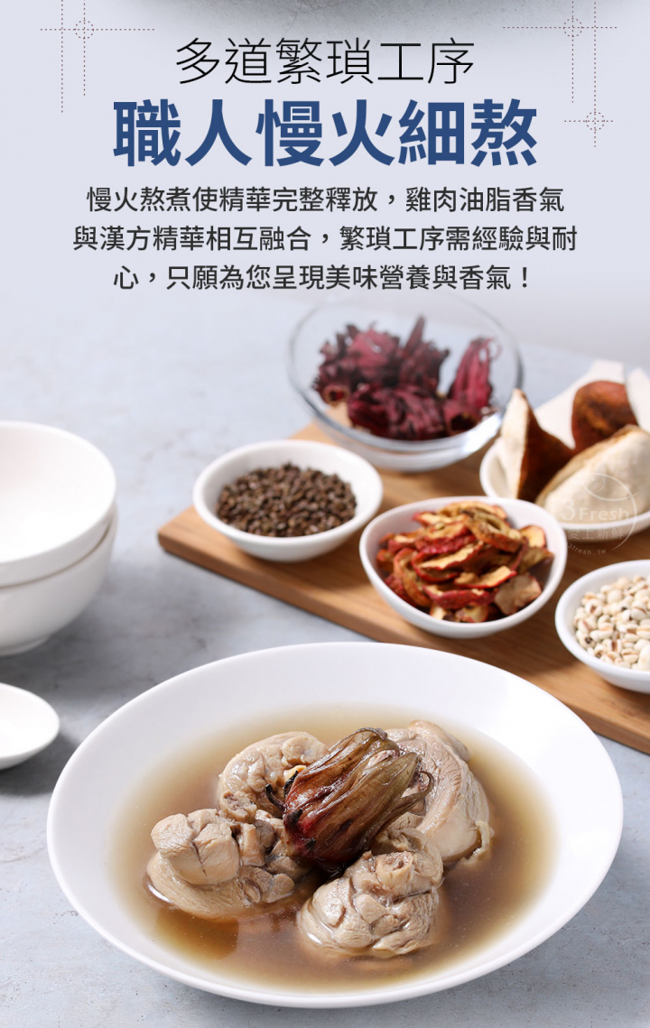 產品成分:水、雞腿塊(美國)、鹽、紹興酒、薏仁、糖、調味粉(碳酸氫鈉、檸檬酸鈉、無水碳酸鈉、食鹽、DL-蘋果酸)、雞粉(雞肉、麥芽糊精、鹽、L-麩酸鈉、糖、5'-次黃嘌呤核苷磷酸二鈉、5'-鳥嘌呤核苷磷酸二鈉、胺基乙酸、DL-胺基丙酸、香料)、決明子、茯苓、仙楂、洛神花、陳皮、烏梅、關華豆膠(黏稠劑)。
