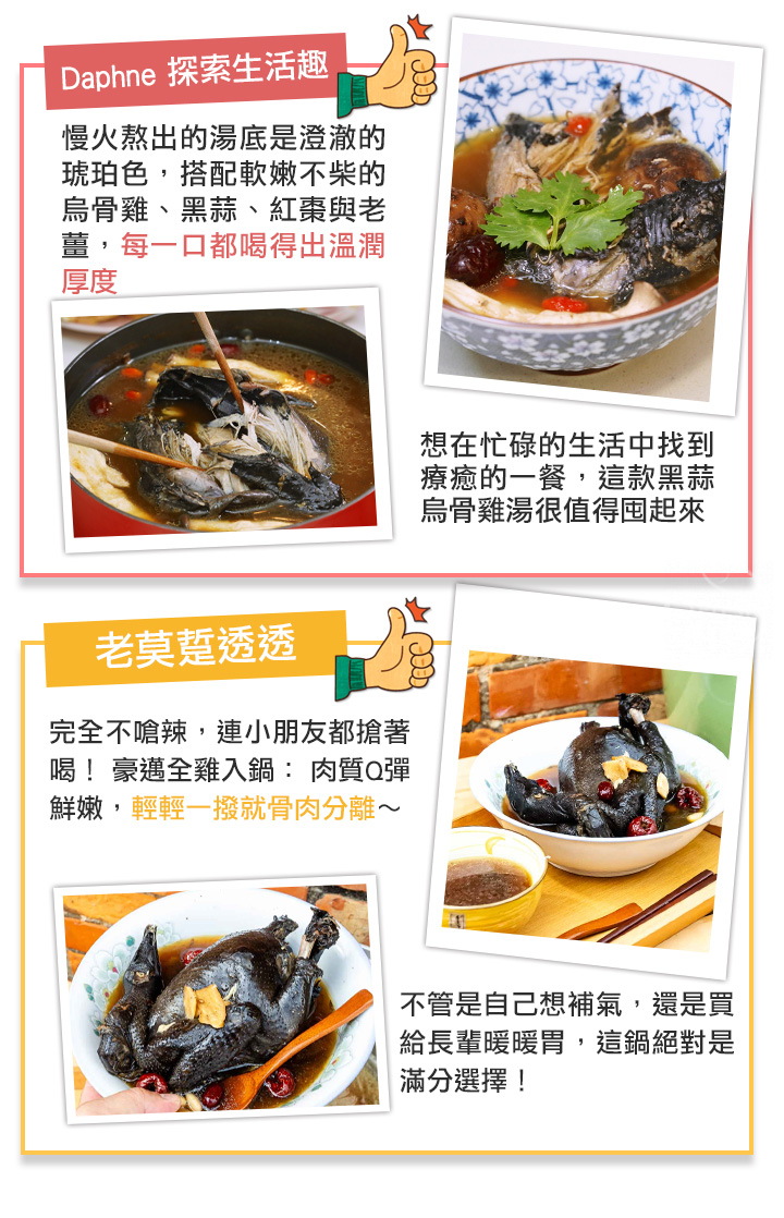 產品成分:水、烏骨雞、米酒、老薑、蒜仁、紅棗、黑蒜頭、鮮雞風味粉【食鹽、L-麩酸鈉、麥芽糊精、酵母抽出物、砂糖、水解植物大豆蛋白粉、洋蔥粉、香料】、肉味風味粉【食鹽、酵母抽出物、L-麩酸鈉、水解植物大豆蛋白粉、乳糖、砂糖、蒜粉、洋蔥粉、糊精、耐炸油(軟質棕櫚油、大豆油、芥花油)、香料】、普通精鹽、乾香菇、頂上高湯粉【L-麩酸鈉、砂糖、食鹽、酵母抽出物、麥芽糊精、洋蔥粉、蒜粉、香菇粉、5'-鳥嘌呤核苷磷酸二鈉、5'-次黃嘌呤核苷磷酸二鈉、水解植物大豆蛋白粉、玉米糖膠、青蔥粉、香料、糊精、耐炸油(軟質棕櫚油、大豆油、芥花油)、甘草酸鈉(甜味劑)】、特砂、雞肉香料【糊精、香料(中鏈三酸甘油酯、香料)】