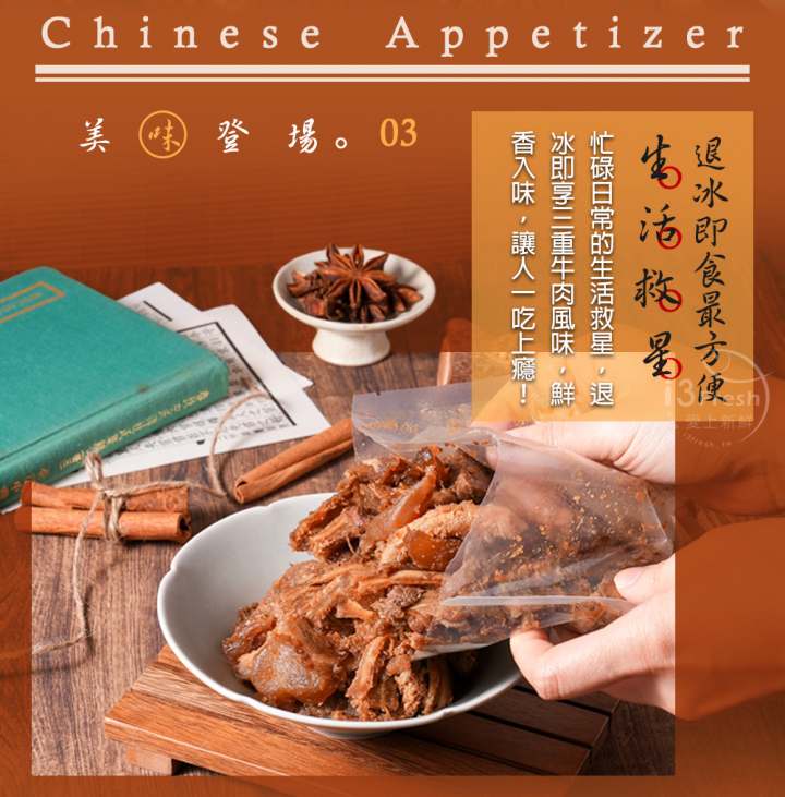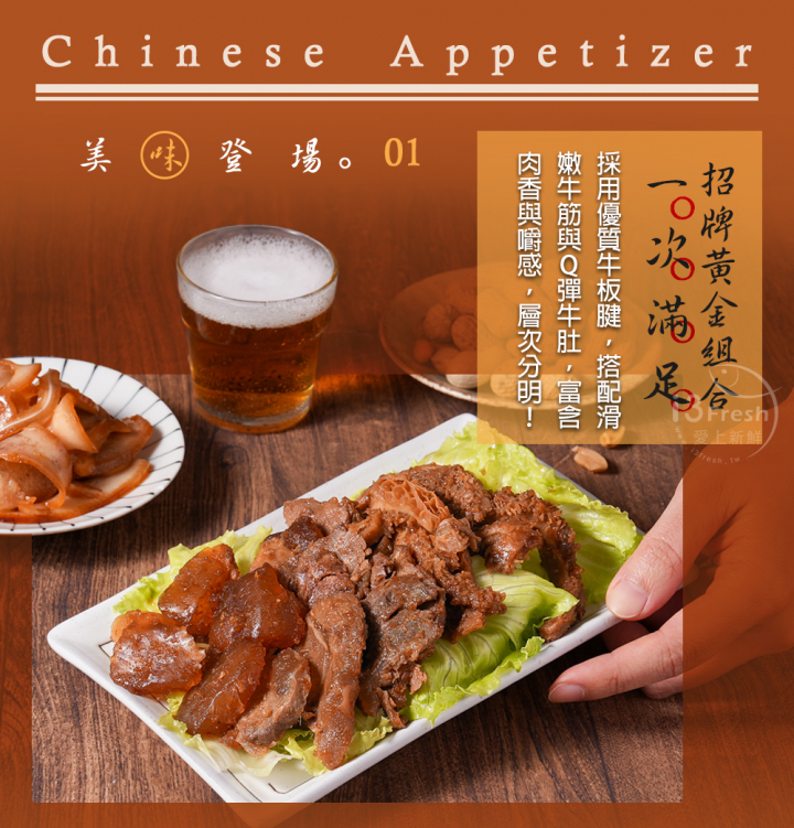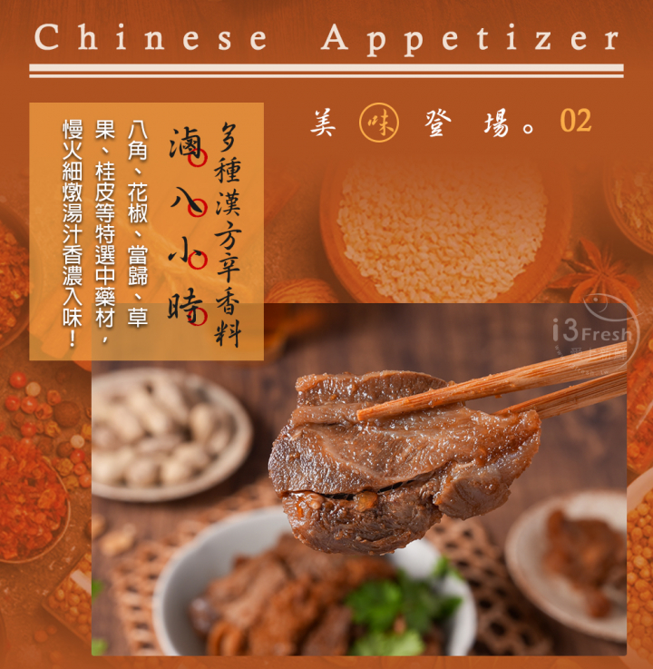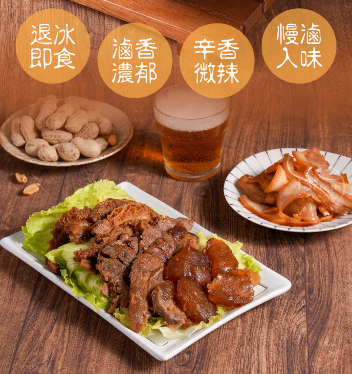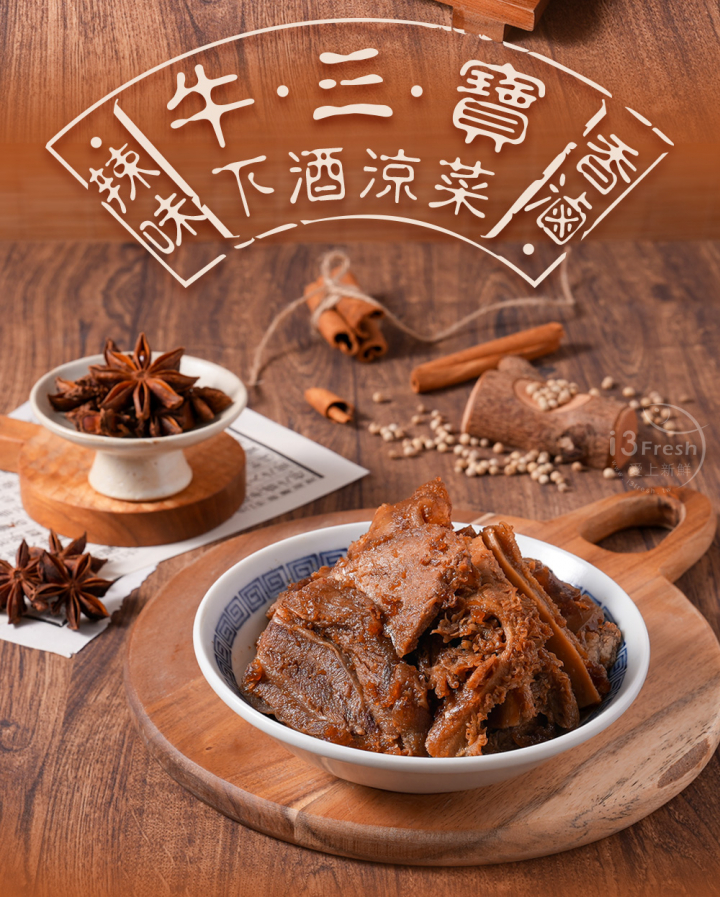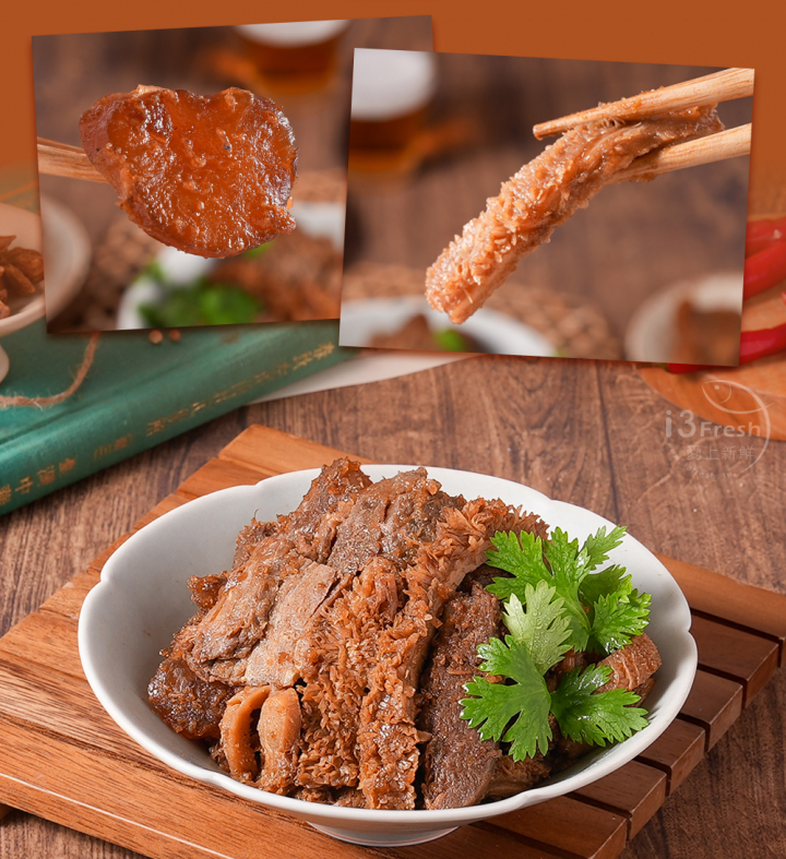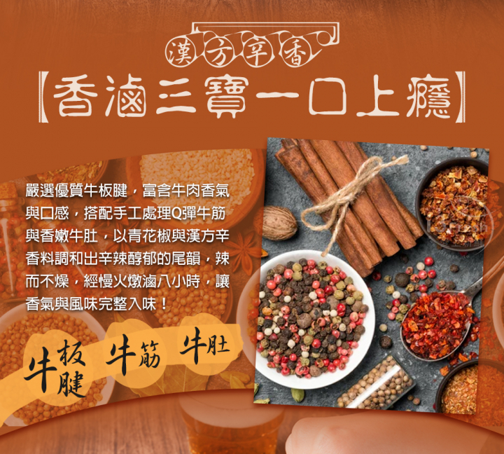 成分 : 牛板腱、牛筋、牛肚、水、白砂糖、米酒、麥芽糖(樹薯澱粉、麥芽粉)、鹽、二砂、味精、肉精粉【食鹽、酵母抽出物、L-麩酸鈉、水解植物大豆蛋白粉、乳糖、砂糖、蒜粉、洋蔥粉、糊精、耐炸油(軟質棕櫚油、大豆油、芥花油)、香料】、肉味醬【麥芽糊精、D-山梨醇液(甜味劑)、水解大豆蛋白調味粉﹝氨基酸(大豆水解蛋白)、鹽﹞、酵母抽出物、水、乳酸、脂肪酸甘油酯(乳化劑)、5'-鳥嘌呤核苷磷酸二鈉、5'-次黃嘌呤核苷磷酸二鈉、香料、焦糖色素、砂糖、食鹽】、青花椒、辣椒粉、水性辣椒抽出物(辣椒、單及雙脂肪酸甘油二乙醯酒石酸酯、卵磷脂、大豆油)、八角、甘草、草果、桂皮、砂仁、小茴香、山奈、乾薑、白胡椒粗粒、荳蔻、當歸、陳皮、月桂葉、丁香