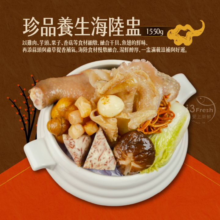 產品成分:高湯{水、鹽、雞肉萃取物(雞肉萃取物、鹽)、L-麩酸鈉、糖、雞油、奶精[葡萄糖漿、完全氫化棕櫚核仁油、乳化劑(脂肪酸甘油酯、單及雙脂肪酸甘油二乙醯酒石酸酯)、乾酪素鈉、檸檬酸鈉、多磷酸鈉、磷酸氫二鉀、碳酸鈣]、酵母萃取物(酵母萃取物、鹽)、豬骨高湯(豬骨、水)、豬油(西班牙)、白湯[高湯(雞骨、豬骨、水、鹽)、雞油、鹽、水、麥芽糊精]、乙醯化己二酸二澱粉、香料、調味劑(5'-次黃嘌呤核苷磷酸二鈉、5'-鳥嘌呤核苷磷酸二鈉)、明膠(豬)、玉米糖膠、刺槐豆膠、β-胡蘿蔔素[麥芽糊精、辛烯基丁二酸鈉澱粉、葵花籽油、抗氧化劑(L-抗壞血酸鈉、維生素C、維生素E)、β-胡蘿蔔素]、花雕酒(米、小麥)、火腿油(中國)、羥丙基磷酸二澱粉、火腿萃取物、焦糖色素、調味粉[鹽、麥芽糊精、L-麩酸鈉、糖、玉米澱粉、雞肉粉、香料、酵母萃取物(酵母萃取物、鹽)、雞油、豬肉粉[豬肉(台灣)、鹽、多磷酸鈉、複合調味劑(乳糖、DL-胺基丙酸、調味劑(5'-次黃嘌呤核苷磷酸二鈉、5'-鳥嘌呤核苷磷酸二鈉)、胺基乙酸、琥珀酸二鈉、檸檬酸鈉)、糖、維生素E(抗氧化劑)]、洋蔥粉、棕櫚油(棕櫚油、硬質棕櫚油)、調味劑(5'-次黃嘌呤核苷磷酸二鈉、5'-鳥嘌呤核苷磷酸二鈉)、白胡椒]}、雞肉、芋頭、栗子、香菇、干貝、魚翅、蒜頭、蟲草。