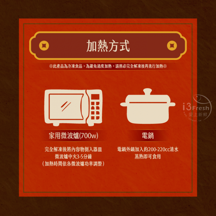 食用方式:完全解凍後倒出內容物,瓦斯爐中火加熱7-10分鐘即可食用。