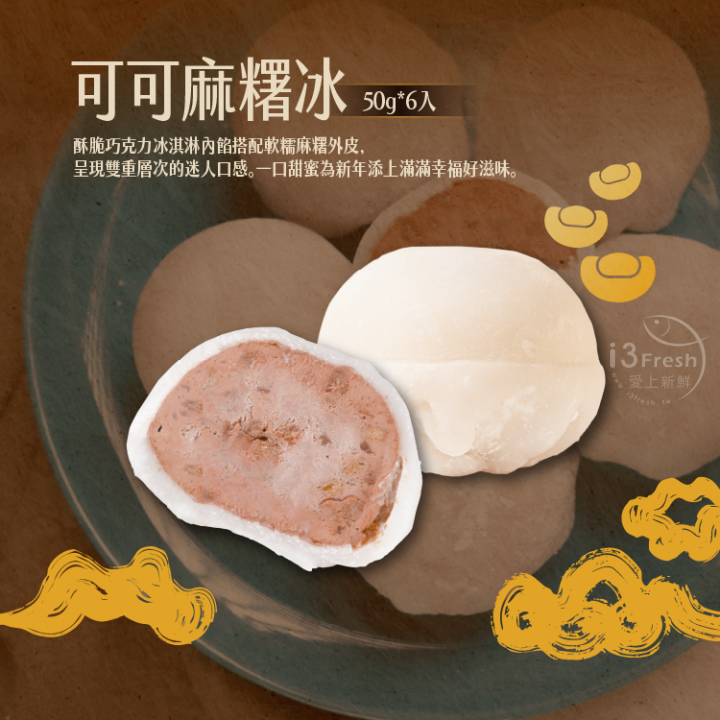 產品成分:麻糬皮{麥芽糖、羥丙基澱粉、乙醯化磷酸二澱粉、樹薯澱粉、香料、脂肪酸蔗糖酯、乳化劑(脂肪酸甘油酯、檸檬酸)、糯米粉、棕櫚油[棕櫚油、抗氧化劑(維生素E)]、砂糖、二氧化鈦}、鮮奶油(乳脂、鹿角菜膠)、巧克力(可可塊、糖、可可脂、減脂可可粉、葵花卵磷脂、天然香草香料)、糖、葡萄糖漿。