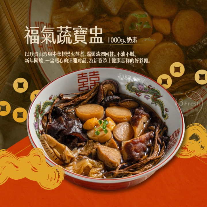 產品成分:高湯(水、大白菜、昆布、紅蘿蔔)、大白菜、白蘿蔔、芋頭、荸薺、素海參(蒟蒻粉、羥丙基磷二酸澱粉、糖、鹽、調味劑(L-麩酸鈉、5'-次黃嘌呤核苷磷酸二鈉、5'-鳥嘌呤核苷磷酸二鈉、胺基乙酸、胺基丙酸、琥珀酸二鈉)、焦糖色素)、柳松菇、巴西蘑菇、木耳、栗子、銀杏、當歸、川芎、紅棗、枸杞、鹽、調味粉(調味劑(L-麩酸鈉、琥珀酸二鈉)、食鹽(食鹽、碘酸鉀)、乳糖(牛乳)、麥芽糊精、菠菜粉、南瓜粉、大白菜粉、白蘿蔔粉、紅蘿蔔粉、香菇粉)。
