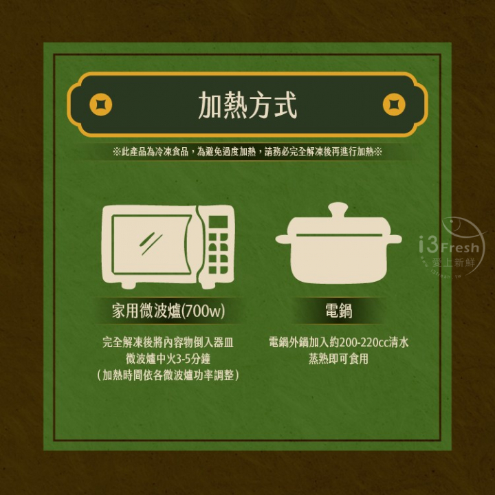 食用方式:完全解凍後倒入容器,瓦斯爐中火加熱4-5分鐘。