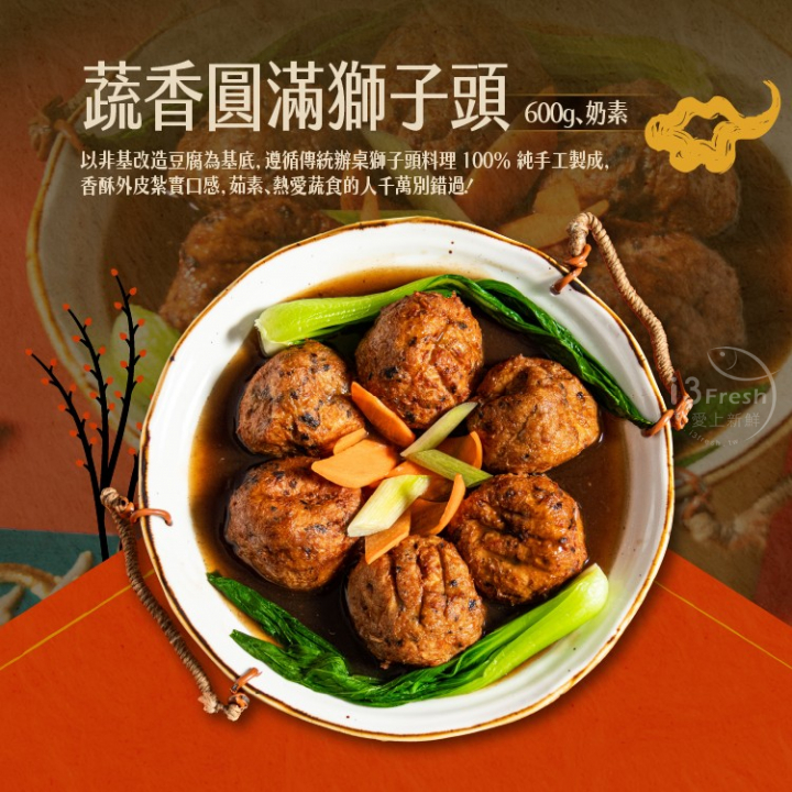 產品成分:豆腐(水、非基因改造黃豆、凝固劑(硫酸鈣)、食鹽、脂肪酸甘油酯、碳酸鈣、卵磷脂)、荸薺、紅蘿蔔、豆干(水、非基因改造黃豆、豆腐用凝固劑 (硫酸鈣、氯化鎂、葡萄糖酸內酯、鹽)、八角、五香粉(小茴、肉桂、大茴香、丁香、花椒)、焦糖色素(著色劑:第一類-普通焦糖)、大豆沙拉油(消泡用)、米糠(消泡用))、木耳、碧玉筍、香菇、芹菜、小麥漿(小麥纖維、味醂(水、蔗糖轉化液糖、酒精、食鹽、糯米)、醋酸鈉(無水)、乳清蛋白、植物水解蛋白、素香料、L-麩酸鈉、胺基乙酸、酵母抽出物、鹽、醬油、大豆沙拉油、糖)、白胡椒、鹽、太白粉(馬鈴薯澱粉)、醬油、糖、薑、調味粉(調味劑(L-麩酸鈉、琥珀酸二鈉)、食鹽(食鹽、碘酸鉀)、乳糖(牛乳)、麥芽糊精、菠菜粉、南瓜粉、大白菜粉、白蘿蔔粉、紅蘿蔔粉、香菇粉)。