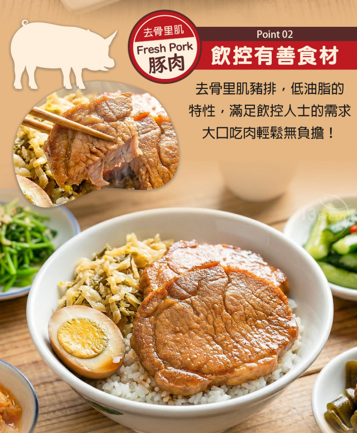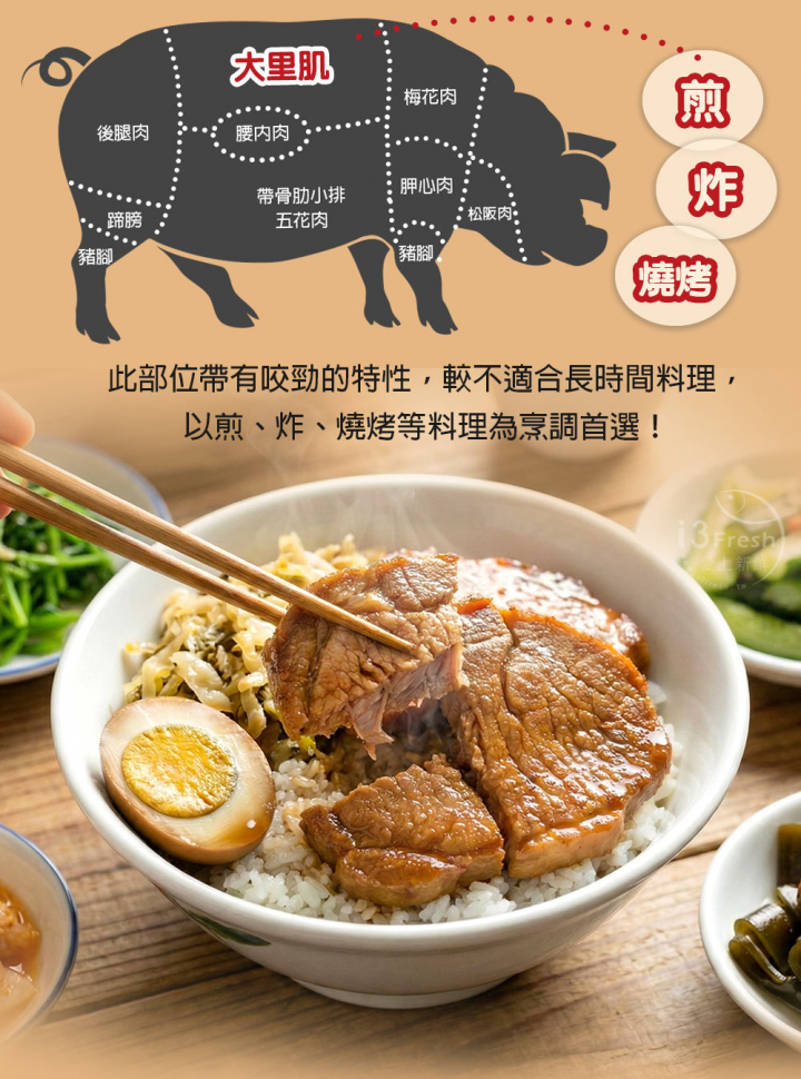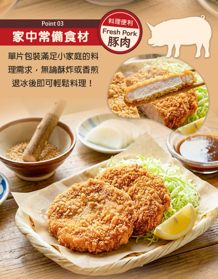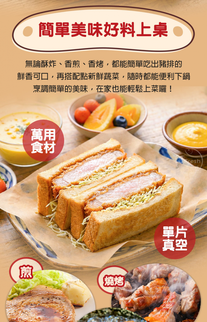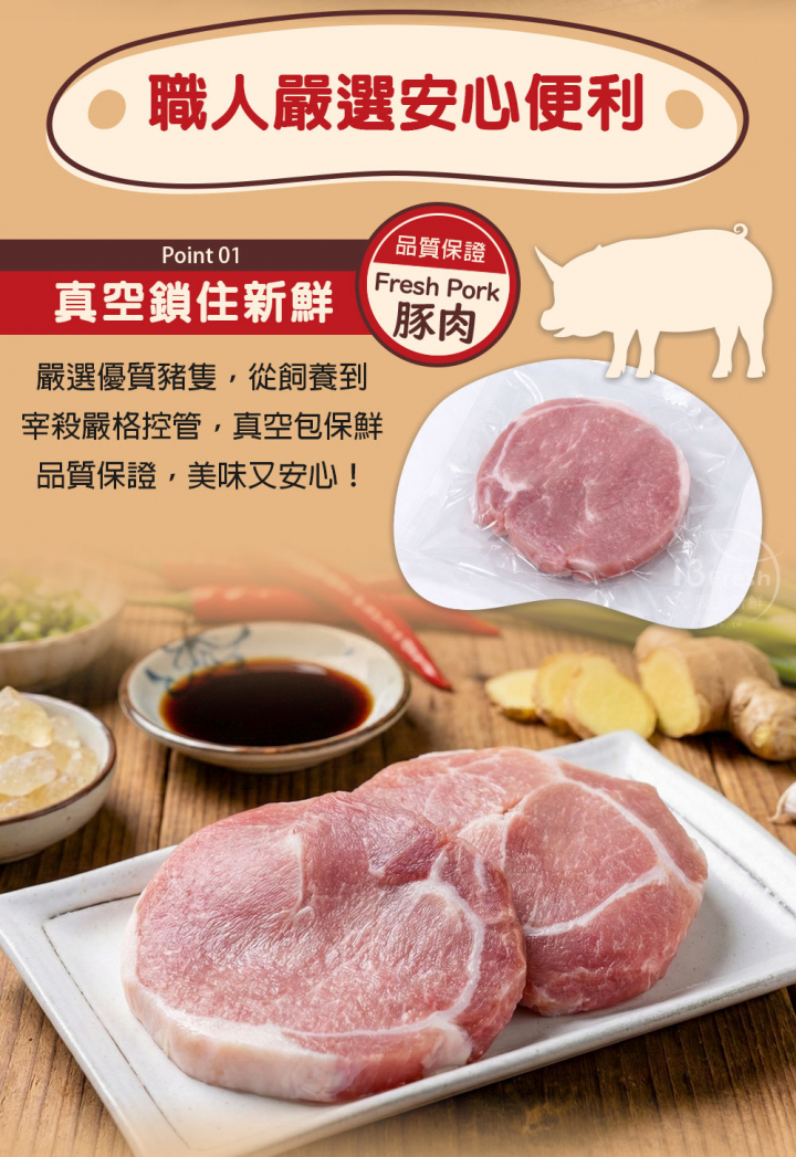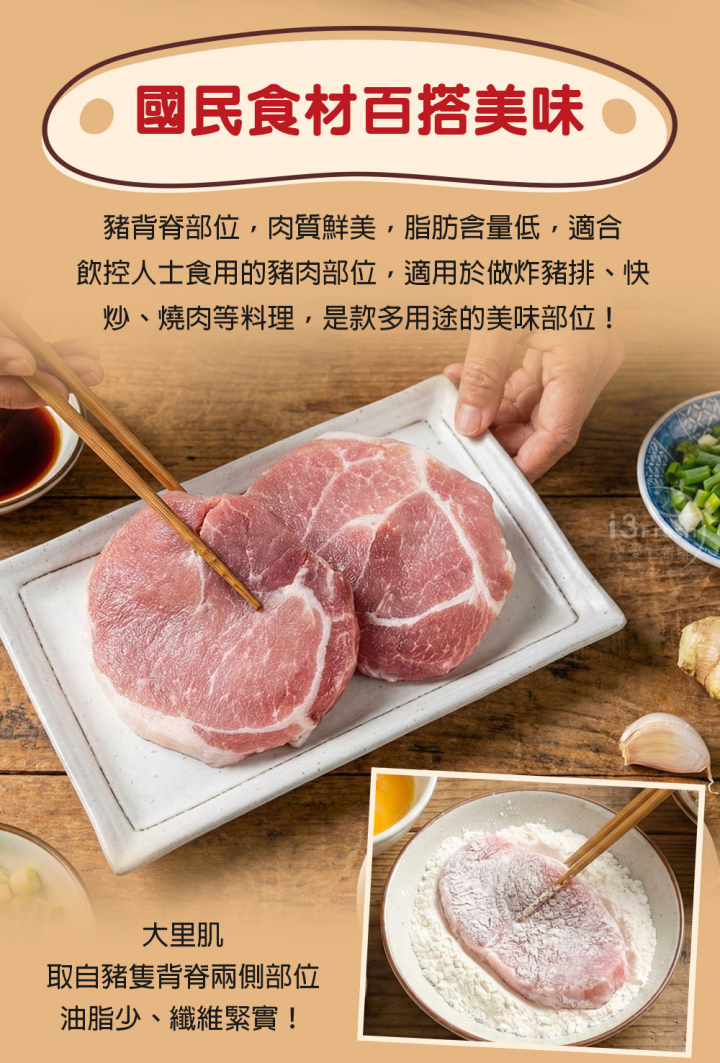 豬背脊部位,肉質鮮美,脂肪含量低,適用於做炸豬排、快炒、燒肉等料理,是款多用途的美味部位!