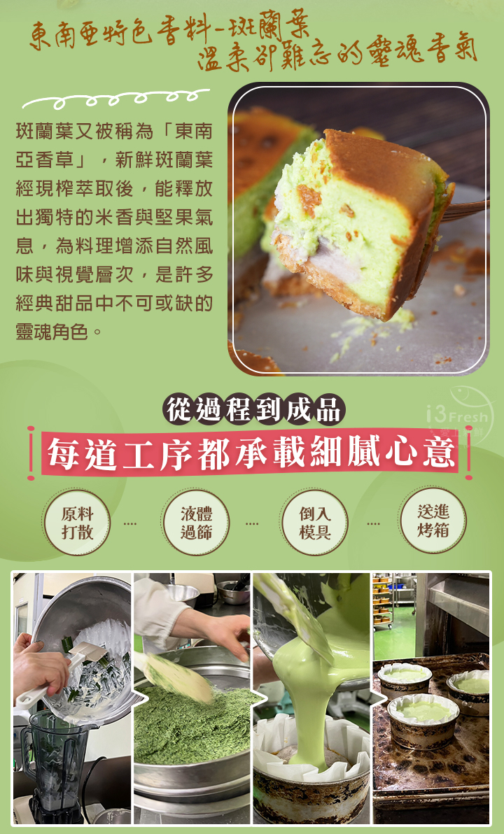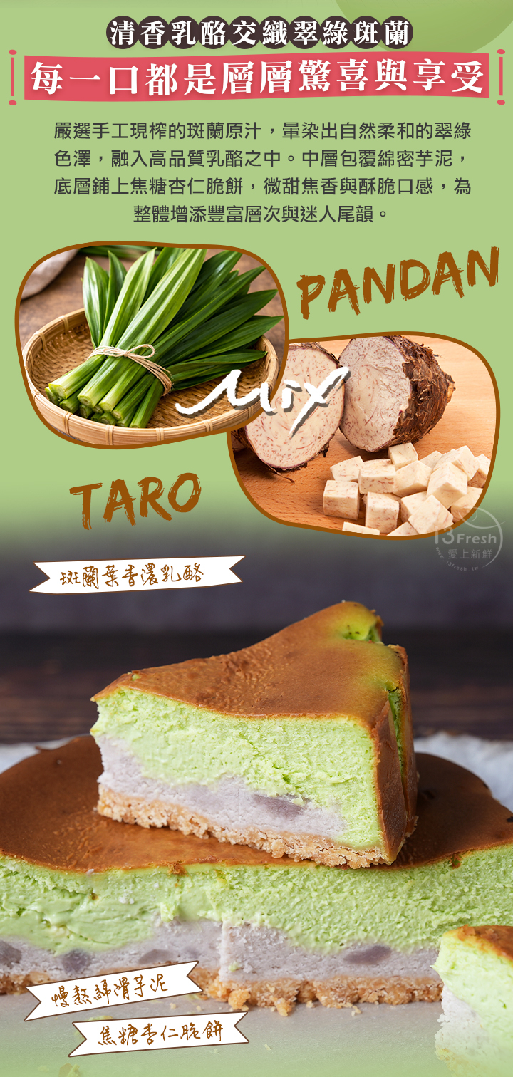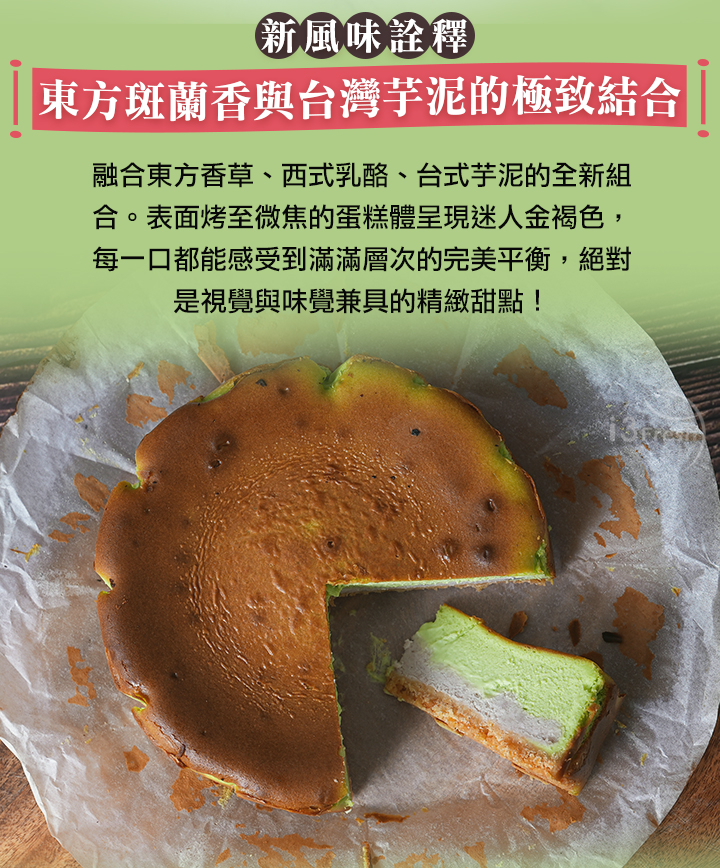 產品成分:乳酪(牛奶、乳脂、鹽、刺槐豆膠、關華豆膠、乳酸菌)、芋泥餡[芋頭、奶精(葡萄糖漿、完全氫化棕櫚仁油、磷酸氫二鉀、乾酪素鈉、碳酸鈣、脂肪酸甘油酯、多磷酸鈉、單及雙脂肪酸甘油二乙醯酒石酸酯、鹽)、海藻糖、蔗糖、D-山梨醇液70%、大豆油、全脂奶粉、食用烤酥油、食鹽、脂肪酸甘油酯]、動物性鮮奶油[鮮奶油(牛乳製品)、脂肪酸甘油酯、鹿角菜膠]、餅乾[小麥麵粉、砂糖、乳清粉、精緻棕櫚油、精製大豆油、精鹽、紅麴粉、奶油香料、牛奶香料、著色劑(胡蘿蔔素)、膨脹劑(碳酸氫銨、碳酸氫鈉)]、雞蛋、糖、新鮮斑蘭葉、無鹽奶油、海藻糖、麵粉、斑蘭香精[水、香料、玉米糖膠、著色劑(食用黃色四號、食用藍色一號)、檸檬酸、防腐劑(己二烯酸鉀)]