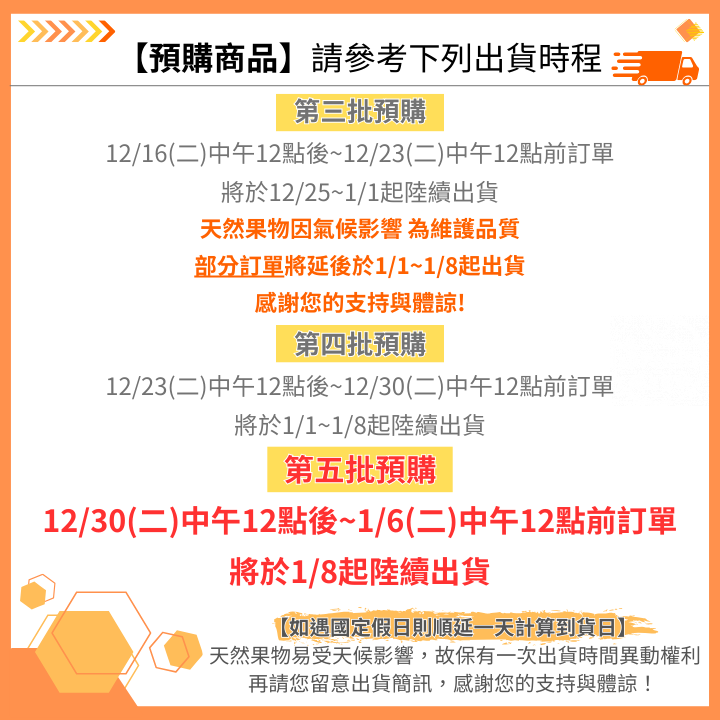 商品重量:3斤(1800g)±5%/箱 [12/5下午6點前訂單為5斤(3000g)±5%/箱]